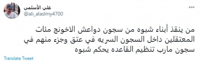 وقال في تغريدة عبر "تويتر" رصدها "المشهد العربي": "من ينقذ أبناء شبوة من سجون دواعش الإخونج؟، مئات المعتقلين داخل السجون السرية في عتق، وجزء منهم في سجون مأرب، تنظيم القاعدة يحكم شبوة".
