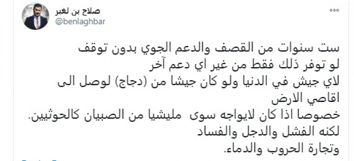 وقال في تغريدة عبر "تويتر" رصدها "المشهد العربي": "ست سنوات من القصف والدعم الجوي بدون توقف لو توفر ذلك فقط من غير أي دعم آخر لأي جيش في الدنيا ولو كان جيشا من (دجاج) لوصل إلى أقاصي الأرض خصوصا إذا كان لا يواجه سوى مليشيا من الصبيان كالحوثيين".