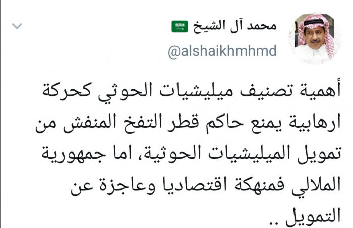 وقال آل الشيخ في تغريدة له عبر "تويتر" رصدها "المشهد العربي": "أهمية تصنيف ميليشيات الحوثي كحركة ارهابية يمنع حاكم قطر التفخ المنفش من تمويل الميليشيات الحوثية، أما جمهورية الملالي فمنهكة اقتصاديا وعاجزة عن التمويل".