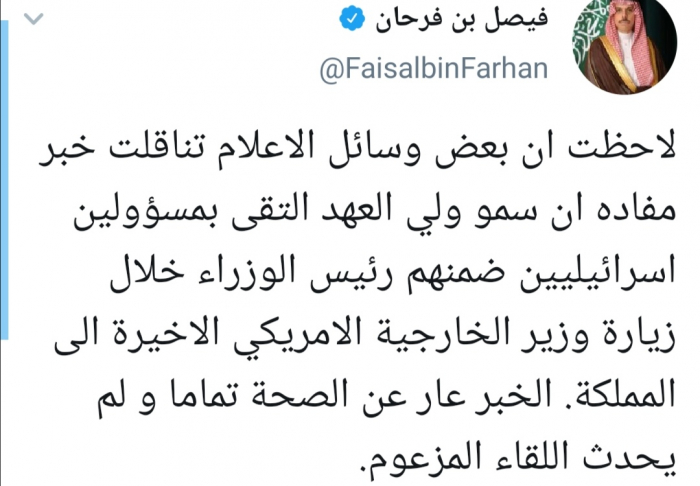 وكتب بن فرحان في تغريدة له عبر حسابه بتويتر ورصدها المشهد العربي: "لاحظت أن بعض وسائل الإعلام تناقلت خبر مفاده أن سمو ولي العهد التقى بمسؤولين إسرائليين ضمنهم رئيس الوزراء خلال زيارة وزير الخارجية الأمريكي الأخيرة إلى المملكة"، مؤكداً أن "الخبر عار عن الصحة تماما و لم يحدث اللقاء المزعوم" .