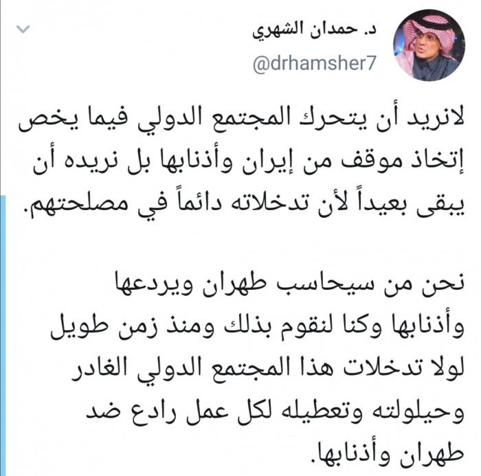 وقال الشهري في تغريدة له عبر حسابه بتويتر ورصدها المشهد العربي: "لانريد أن يتحرك المجتمع الدولي فيما يخص إتخاذ موقف من إيران وأذنابها بل نريده أن يبقى بعيداً لأن تدخلاته دائماً في مصلحتهم".