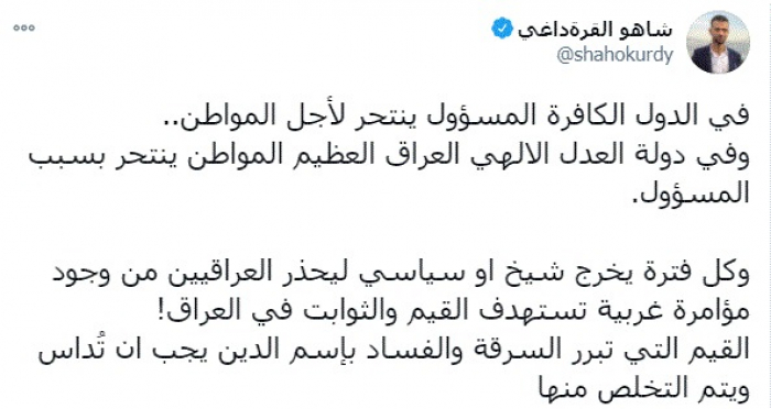 وقال في تغريدة عبر "تويتر" رصدها "المشهد العربي": "في الدول الكافرة المسؤول ينتحر لأجل المواطن.. وفي دولة العدل الالهي العراق العظيم المواطن ينتحر بسبب المسؤول".