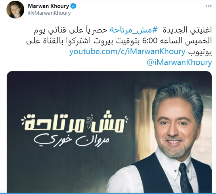 ونشر "خوري" بوستر الأغنية، عبر حسابه الرسمي بموقع "تويتر"، علق :"أغنيتي الجديدة مش مرتاحة حصريًا على قناتي يوم الخميس الساعة 6 بتوقيت بيروت".