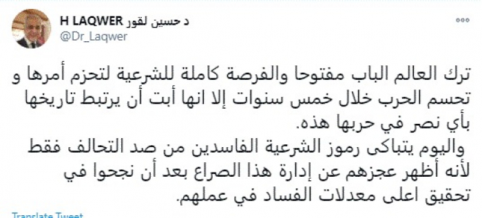 وقال في تغريدة عبر "تويتر" رصدها "المشهد العربي": "ترك العالم الباب مفتوحًا والفرصة كاملة للشرعية لتحزم أمرها وتحسم الحرب خلال خمس سنوات إلا أنها أبت أن يرتبط تاريخها بأي نصر في حربها هذه".