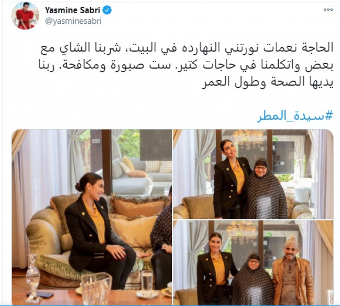 استقبلت الفنانة ياسمين صبري، في منزلها، اليوم الاثنين، نعمات عبدالحميد، التي اشتهرت خلال الأيام القليلة الماضية إعلاميًا باسم "سيدة المطر"، بعدما التُقطت لها صورة وهي تصر على بيع منتجاتها البسيطة رغم سقوط الأمطار الغزيرة.