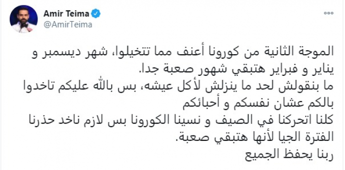 وكتب طعيمة، عبر حسابه على تويتر: "الموجة الثانية من كورونا أعنف مما تتخيلوا، شهر ديسمبر ويناير وفبراير هتبقى شهور صعبة جدًا".