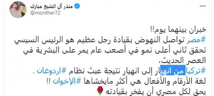 وقال في تغريدة عبر "تويتر" رصدها "المشهد العربي": "خبران بينهما يوم!! مصر تواصل النهوض بقيادة رجل عظيم هو الرئيس السيسي تحقق ثاني أعلى نمو في أصعب عام يمر على البشرية في العصر الحديث، تركيا من انهيار إلى انهيار نتيجة عبث نظام أردوغان".