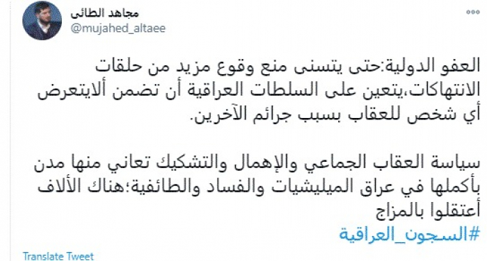 وقال في تغريدة عبر "تويتر" رصدها "المشهد العربي": "العفو الدولية: حتى يتسنى منع وقوع مزيد من حلقات الانتهاكات، يتعين على السلطات العراقية أن تضمن ألا يتعرض أي شخص للعقاب بسبب جرائم الآخرين. سياسة العقاب الجماعي والإهمال والتشكيك تعاني منها مدن بأكملها في عراق الميليشيات والفساد والطائفية؛هناك الألاف أعتقلوا بالمزاج".