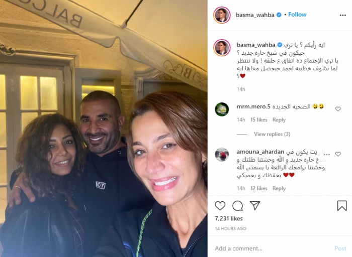 نشرت المذيعة المصرية بسمة وهبة صورة تجمعها بالمطرب أحمد سعد وخطيبته علياء بسيوني، عبر حسابها الرسمي بموقع "إنستجرام".
