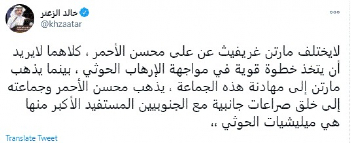 وكتب في تغريدة عبر "تويتر" رصدها "المشهد العربي": "لا يختلف مارتن غريفيث عن علي محسن الأحمر ، كلاهما لا يريد أن يتخذ خطوة قوية في مواجهة الإرهاب الحوثي ، بينما يذهب مارتن إلى مهادنة هذه الجماعة، يذهب محسن الأحمر وجماعته إلى خلق صراعات جانبية مع الجنوبيين المستفيد الأكبر منها هي مليشيات الحوثي".