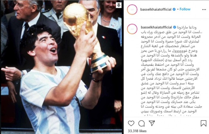 ونشر "خياط" صورة مارادونا، عبر حسابه الرسمي بموقع "إنستجرام"، وعلق: "وداعا مارادونا ...لست أنا الوحيد من علق صورتك وراء باب الخزانة ولست أنا الوحيد من يدخر مصروفه ليشتري لك صورا مميزة ولست أنا الوحيد من استعار شخصيتك في لعبة الشارع وصرخ جوووول، مارادونا حين يحرز هدفا ولو بالصدفة".