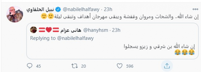 ورد على أحد مشجي الزمالك بعدما تمنى تسجيل كل من بن شرقي وزيزو، ومازحه :" إن شاء الله.. والشحات ومروان وقفشة ويبقى مهرجان أهداف وتبقى ليلة".