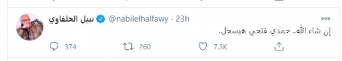 وكتب الحلفاوي، عبر حسابه الرسمي على تويتر: "إن شاء الله.. حمدي فتحي هيسجل".