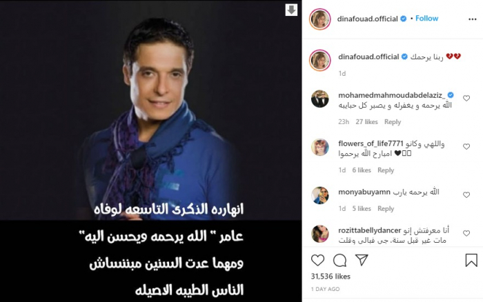 ونشرت دينا، صورة له عبر حسابها على إنستجرام، وعلقت عليها: "النهاردة الذكرى التاسعة لوفاة عامر، الله يرحمه ويحسن إليه..ومهما عدت السنين ..مبننساش الناس الطيبة الأصيلة"، كما كتبت أسفل الصورة: "ربنا يرحمك".