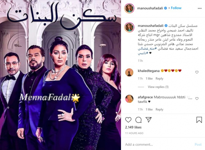 ونشرت منة بوستر المسلسل، وعلقت : "مسلسل سكن البنات تأليف احمد صبحي واخراج محمد النقلي انتاج شركه mgr الاستاذ ممدوح شاهين النجوم وفاء عامر ايتن عامر منذر ريحانه محمد نجاتي هاجر الشرنوبي حسني شتا احمد جمال سعيد منه فضالي".