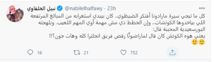 وكتب الفنان المصري نبيل الحلفاوي تغريدة، عبر حسابه الرسمي بموقع تويتر: "كل ما تيجي سيرة مارادونا أفتكر الضيظوي.. كان بيبدي استغرابه من المبالغ المرتفعة اللي بياخدوها الكوتشات.. وإن الخطط دي مش مهمة أوي المهم اللعيب. وبلهجته البورسعيدية المحببة قال:" يعني هوه الكوتش كان قال لمارادونا رقص فريق انجلترا كله وهات جون".