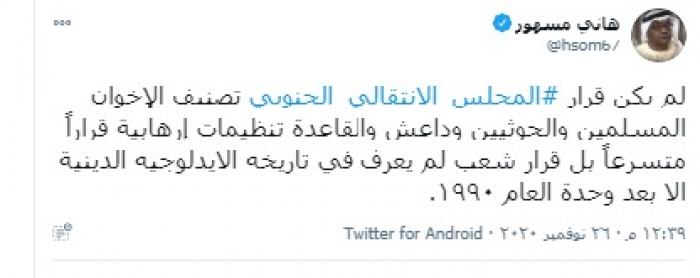 وكتب "مسهور" تغريدة عبر تويتر، رصدها "المشهد العربي": "لم يكن قرار المجلس الانتقالي الجنوبي تصنيف الإخوان المسلمين والحوثيين وداعش والقاعدة تنظيمات إرهابية قرارًا متسرعًا بل قرار شعب لم يعرف في تاريخه الأيدلوجية الدينية إلا بعد وحدة العام 1990".