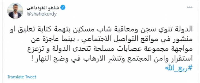 انتقد الكاتب الصحفي العراقي شاهو القرةداغي، اليوم، السلطات العراقية جراء فشلها في مواجهة المليشيات الموالية لإيران في العراق.