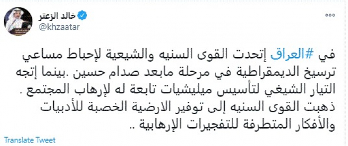 وقال في تغريدة عبر "تويتر" رصدها "المشهد العربي": "في العراق إتحدت القوى السنيه والشيعية لإحباط مساعي ترسيخ الديمقراطية في مرحلة مابعد صدام حسين .بينما إتجه التيار الشيغي لتأسيس ميليشيات تابعة له لإرهاب المجتمع . ذهبت القوى السنيه إلى توفير الارضية الخصبة للأدبيات والأفكار المتطرفة للتفجيرات الإرهابية".