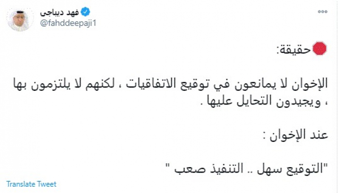 وقال في تغريدة عبر "تويتر" رصدها "المشهد العربي": "حقيقة: الإخوان لا يمانعون في توقيع الاتفاقيات ، لكنهم لا يلتزمون بها ، ويجيدون التحايل عليها .