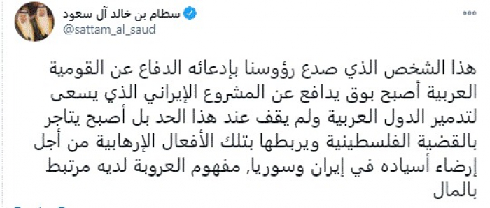 هاجم الأمير السعودي البارز سطام بن خالد آل سعود، اليوم، الكاتب والصحفي الفلسطيني عبدالباري عطوان، مؤكدًا أنه أصبح مجرد بوق يُدافع للمشروع الإيراني الذي يسعى لتدمير الدول العربية.