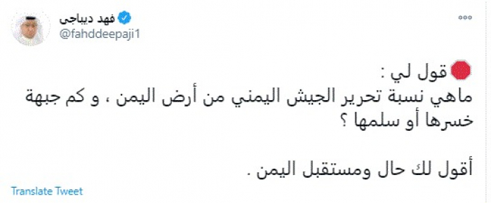 وقال في تغريدة عبر "تويتر" رصدها "المشهد العربي": "قول لي: ماهي نسبة تحرير الجيش اليمني من أرض اليمن، وكم جبهة خسرها أو سلمها؟ أقول لك حال ومستقبل اليمن".