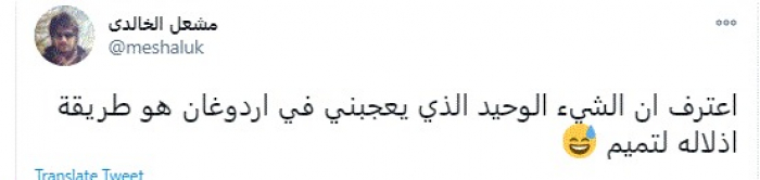 وقال في تغريدة عبر "تويتر" رصدها "المشهد العربي": "اعترف أن الشيء الوحيد الذي يعجبني في أردوغان هو طريقة إذلاله لتميم".