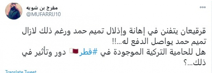 وقال في تغريدة عبر "تويتر" رصدها "المشهد العربي": "قرقيعان يتفنن في إهانة وإذلال تميم حمد ورغم ذلك لا زال تميم حمد يواصل الدفع له.. هل للحامية التركية الموجودة في قطر دور وتأثير في ذلك؟".