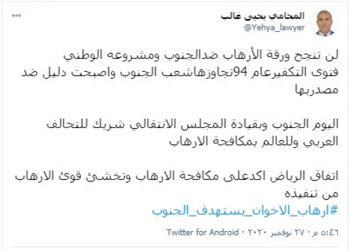 وكتب "غالب" تغريدة عبر حسابه بتويتر، رصدها "المشهد العربي" قال فيها: لن تنجح ورقة الإرهاب ضد الجنوب ومشروعه الوطني".