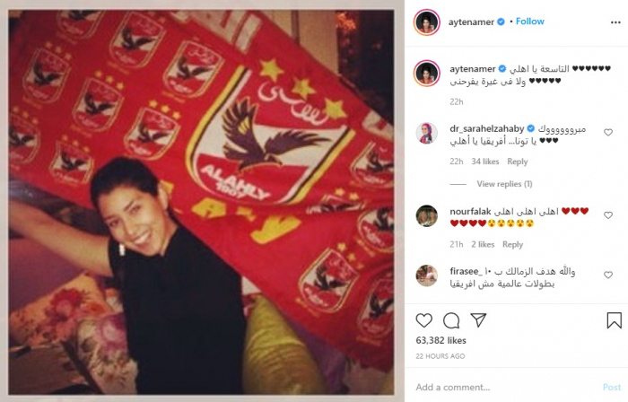 ونشرت أيتن، صورة لها وهي تحمل علم الأهلي عبر حسابها على "إنستجرام" قائلةً: "التاسعة يا أهلي.. ولا في غيره يفرحني".