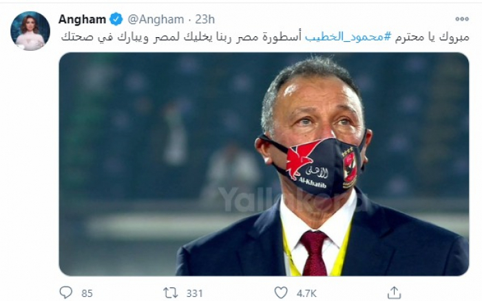 ونشرت أنغام، صورة للخطيب عبر حسابها على موقع "تويتر"، وعلّقت: "مبروك يا محترم.. محمود الخطيب أسطورة مصر.. ربنا يخليك لمصر ويبارك في صحتك".
