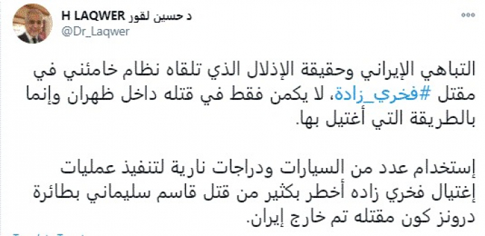 وكتب في تغريدة عبر "تويتر" رصدها "المشهد العربي": "التباهي الإيراني وحقيقة الإذلال الذي تلقاه نظام خامئني في مقتل فخري زادة، لا يكمن فقط في قتله داخل ظهران وإنما بالطريقة التي أغتيل بها".
