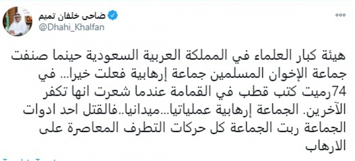 أشاد نائب مدير الشرطة والأمن العام في دبي الفريق ضاحي خلفان، اليوم، بقرار هيئة كبار العلماء بالسعودية بتصنيف الإخوان كجماعة إرهابية، مؤكدًا أن تلك الجماعة إرهابية عملياتيًا وميدانيًا.