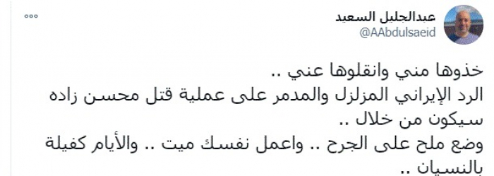 وقال في تغريدة عبر "تويتر" رصدها "المشهد العربي": "خذوها مني وانقلوها عني .. الرد الإيراني المزلزل والمدمر على عملية قتل محسن زاده سيكون من خلال ..وضع ملح على الجرح .. واعمل نفسك ميت .. والأيام كفيلة بالنسيان".