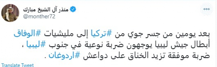وقال في تغريدة عبر "تويتر" رصدها "المشهد العربي": "بعد يومين من جسر جوي من تركيا إلى مليشيات الوفاق أبطال جيش ليبيا يوجهون ضربة نوعية في جنوب ليبيا، ضربة موفقة تزيد الخناق على دواعش أردوغان".