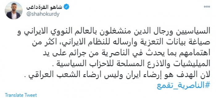 وكتب في تغريدة عبر "تويتر" رصدها "المشهد العربي": "السياسيين ورجال الدين منشغلون بالعالم النووي الإيراني وصياغة بيانات التعزية وإرساله للنظام الايراني، أكثر من اهتمامهم بما يحدث في الناصرية من جرائم على يد الميليشيات والاذرع المسلحة للأحزاب السياسية .لأن الهدف هو إرضاء ايران وليس إرضاء الشعب العراقي".