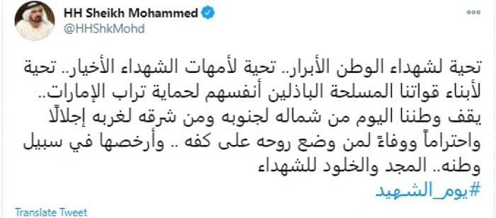 وكتب في تغريدة عبر "تويتر" رصدها "المشهد العربي": "تحية لشهداء الوطن الأبرار.. تحية لأمهات الشهداء الأخيار.. تحية لأبناء قواتنا المسلحة الباذلين أنفسهم لحماية تراب الإمارات.. يقف وطننا اليوم من شماله لجنوبه ومن شرقه لغربه إجلالًا واحتراماً ووفاءً لمن وضع روحه على كفه .. وأرخصها في سبيل وطنه.. المجد والخلود للشهداء".