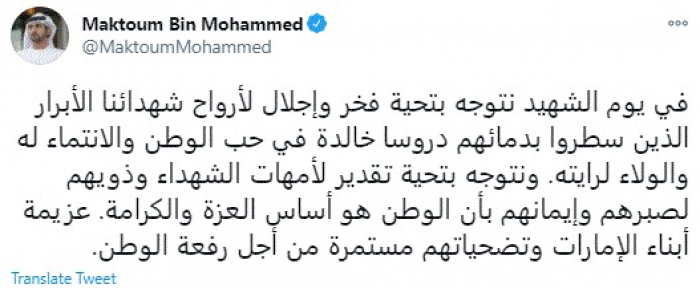 وأضاف: "ونتوجه بتحية تقدير لأمهات الشهداء وذويهم لصبرهم وإيمانهم بأن الوطن هو أساس العزة والكرامة. عزيمة أبناء الإمارات وتضحياتهم مستمرة من أجل رفعة الوطن".