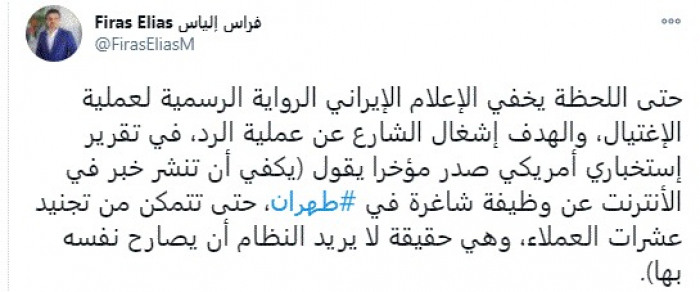 وقال في تغريدة عبر "تويتر" رصدها "المشهد العربي": "حتى اللحظة يخفي الإعلام الإيراني الرواية الرسمية لعملية الإغتيال، والهدف إشغال الشارع عن عملية الرد، في تقرير إستخباري أمريكي صدر مؤخرا يقول (يكفي أن تنشر خبر في الأنترنت عن وظيفة شاغرة في طهران، حتى تتمكن من تجنيد عشرات العملاء، وهي حقيقة لا يريد النظام أن يصارح نفسه بها)".
