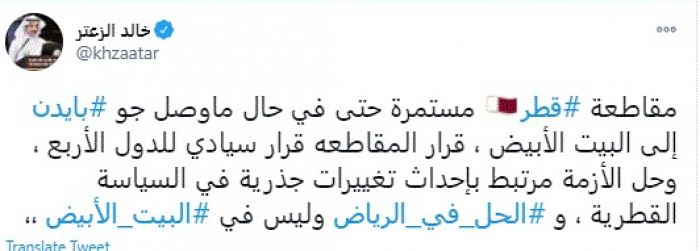 وكتب في تغريدة عبر "تويتر" رصدها "المشهد العربي": "مقاطعة قطر مستمرة حتى في حال ما وصل جو بايدن إلى البيت الأبيض، قرار المقاطعة قرار سيادي للدول الأربع، وحل الأزمة مرتبط بإحداث تغييرات جذرية في السياسة القطرية، والحل في الرياض وليس في البيت الأبيض".