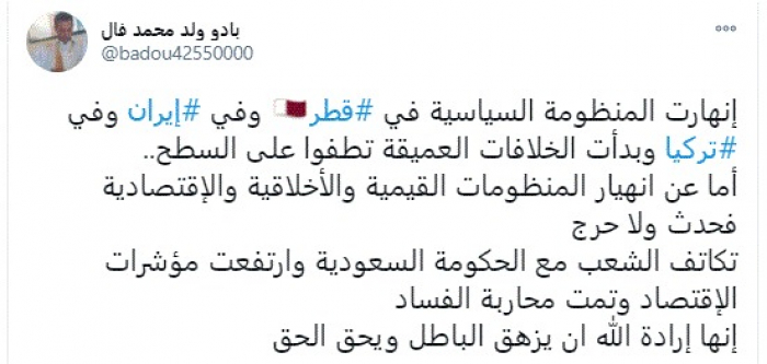 وكتب في تغريدة عبر "تويتر" رصدها "المشهد العربي": "إنهارت المنظومة السياسية في قطر وفي إيران وفي تركيا وبدأت الخلافات العميقة تطفوا على السطح.. أما عن انهيار المنظومات القيمية والأخلاقية والإقتصادية فحدث ولا حرج تكاتف الشعب مع الحكومة السعودية وارتفعت مؤشرات الإقتصاد وتمت محاربة الفساد إنها إرادة الله ان يزهق الباطل ويحق الحق".