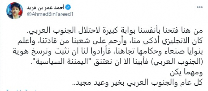 وقال في تغريدة عبر "تويتر" رصدها "المشهد العربي": "من هنا فتحنا بأنفسنا بوابة كبيرة لاحتلال الجنوب العربي. كان الإنجليزي أذكى منا، وأرحم على شعبنا من قادتنا، وأعلم بنوايا صنعاء وحكامها تجاهنا، فأرادوا لنا ان نثبت ونرسخ هوية (الجنوب العربي) فأبينا إلا أن نعتنق اليمننة السياسية".
