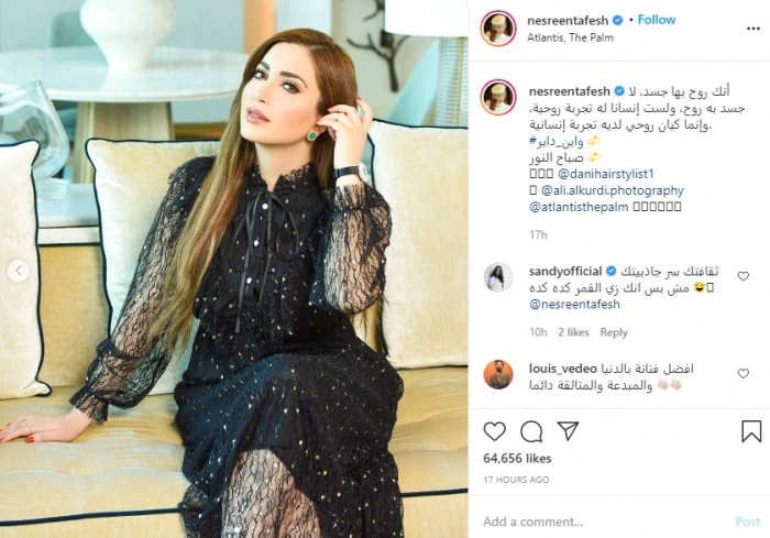 نشرت "نسرين" عبر حسابها بموقع انستجرام صورتين من أحدث إطلالتها، حيث أرتدت فستان انيق باللون الأسود.