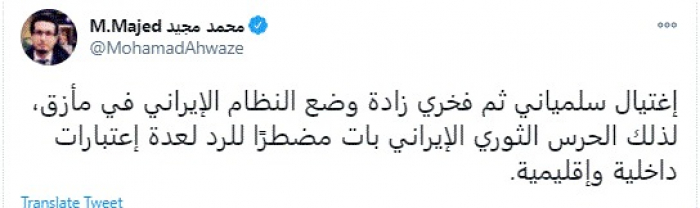 وكتب في تغريدة عبر "تويتر" رصدها "المشهد العربي": "اغتيال سلمياني ثم فخري زادة وضع النظام الإيراني في مأزق، لذلك الحرس الثوري الإيراني بات مضطرًا للرد لعدة إعتبارات داخلية وإقليمية".