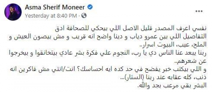 وكتبت أسما، عبر حسابها بموقع "فيسبوك": "نفسي أعرف المصدر قليل الأصل اللي بيحكي للصحافة أدق التفاصيل اللي بين عمرو دياب ودينا الشربيني، واضح أنه قريب ومش بيصون العيش والملح، عيب، البيوت أسرار".