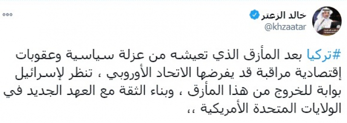 وكتب في تغريدة عبر "تويتر" رصدها "المشهد العربي": "تركيا بعد المأزق الذي تعيشه من عزلة سياسية وعقوبات إقتصادية مراقبة قد يفرضها الاتحاد الأوروبي ، تنظر لإسرائيل بوابة للخروج من هذا المأزق ، وبناء الثقة مع العهد الجديد في الولايات المتحدة الأمريكية".