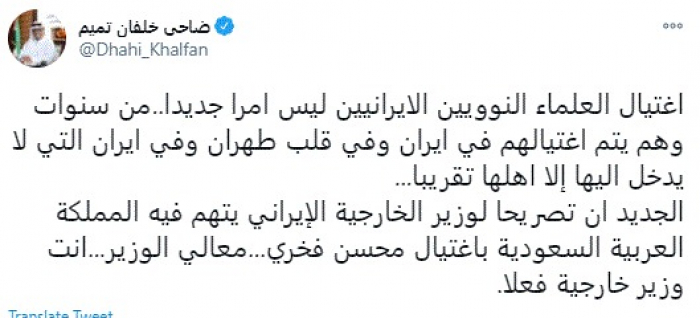 وأضاف: "الجديد أن تصريحا لوزير الخارجية الإيراني يتهم فيه المملكة العربية السعودية باغتيال محسن فخري...معالي الوزير...انت وزير خارجية فعلاً".