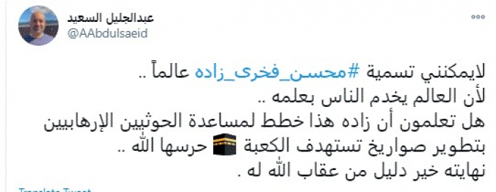 وقال في تغريدة عبر "تويتر" رصدها "المشهد العربي": "لا يمكنني تسمية محسن فخري زاده عالمًا.. لأن العالم يخدم الناس بعلمه.. هل تعلمون أن زادة هذا خطط لمساعدة الحوثيين الإرهابيين بتطوير صواريخ تستهدف الكعبة حرسها الله.. نهايته خير دليل من عقاب الله له".
