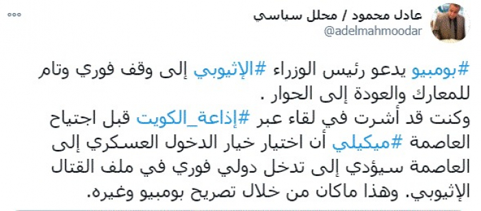 وقال في تغريدة عبر "تويتر" رصدها "المشهد العربي": "بومبيو يدعو رئيس الوزراء الإثيوبي إلى وقف فوري وتام للمعارك والعودة إلى الحوار. وكنت قد أشرت في لقاء عبر إذاعة الكويت قبل اجتياح العاصمة ميكيلي أن اختيار خيار الدخول العسكري إلى العاصمة سيؤدي إلى تدخل دولي فوري في ملف القتال الإثيوبي. وهذا ما كان من خلال تصريح بومبيو وغيره".