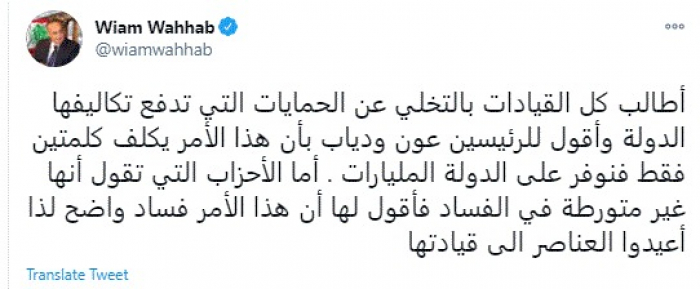 طالب السياسي اللبناني البارز وئام وهاب، اليوم، القيادات اللبنانية بالتخلي عن الحمايات.